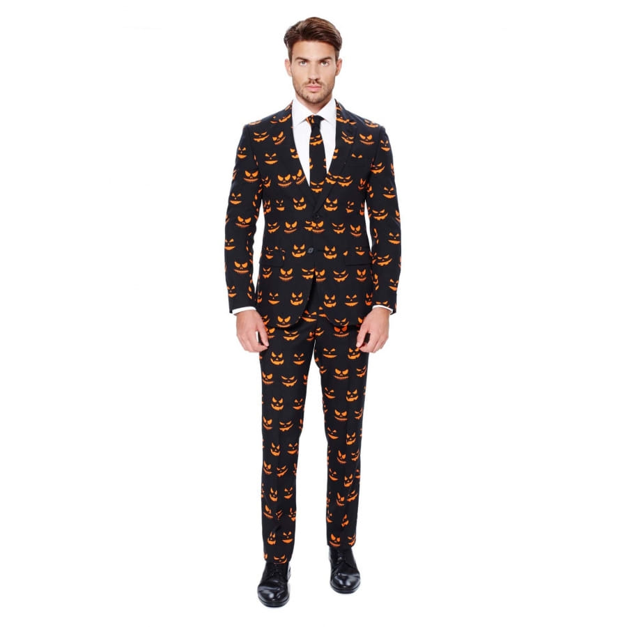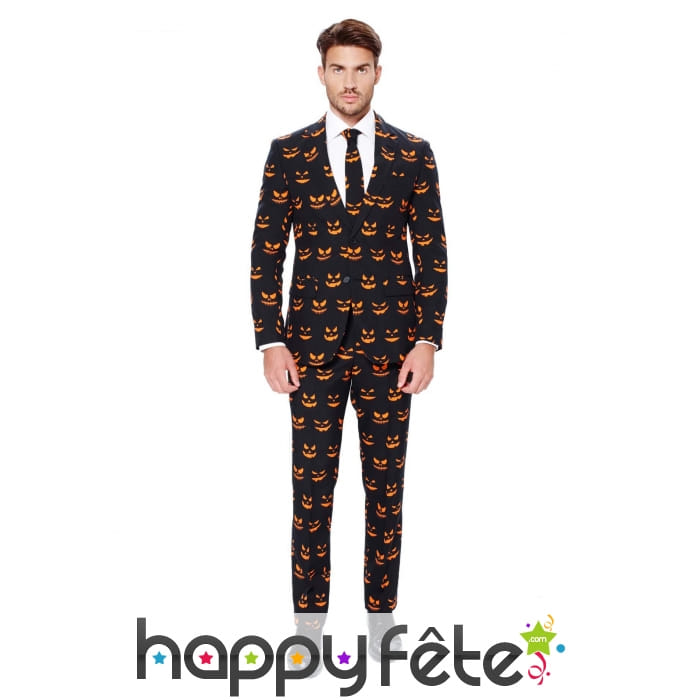 Être classe et élégant tout en étant dans le thème d'Halloween est possible avec ce costume 3 pièces noir imprimé visage et citrouille.