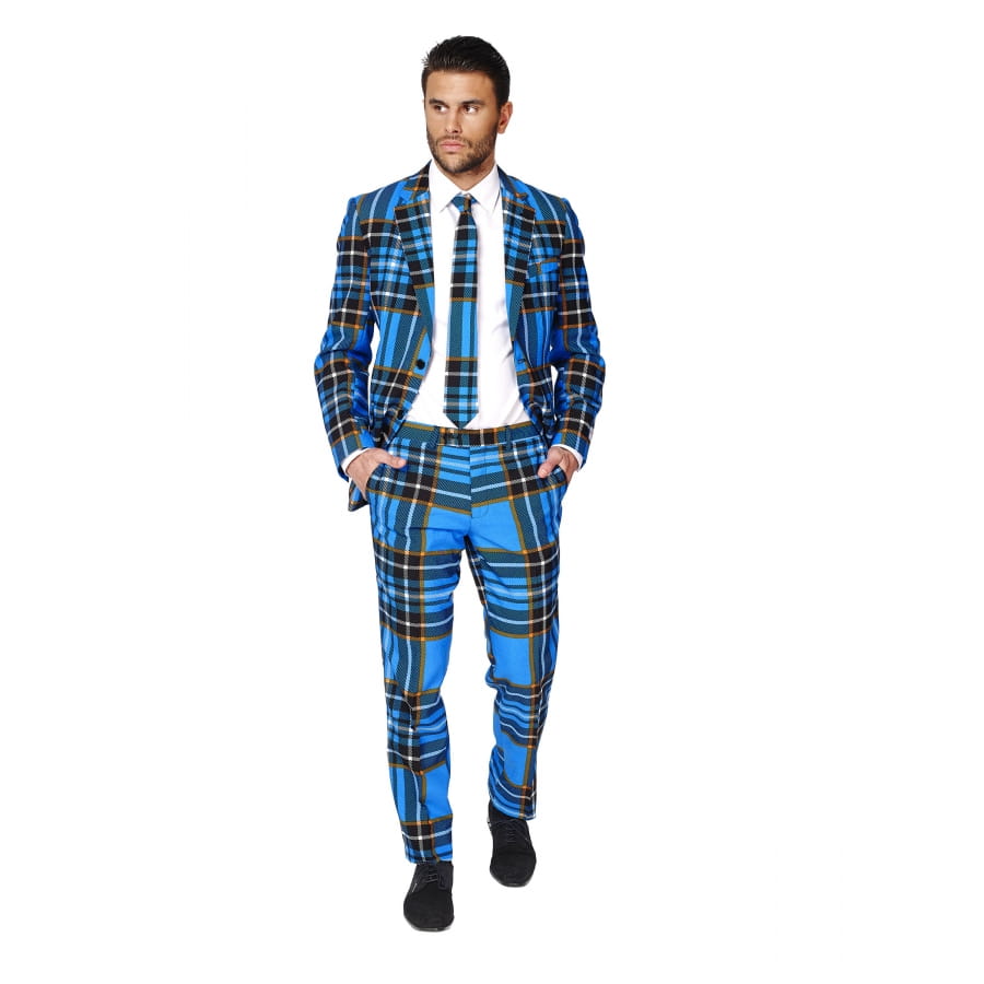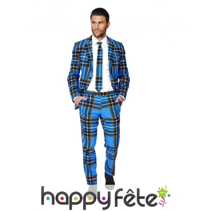 Il comprend une veste, une cravate et un pantalon avec des motifs de carreaux écossais.