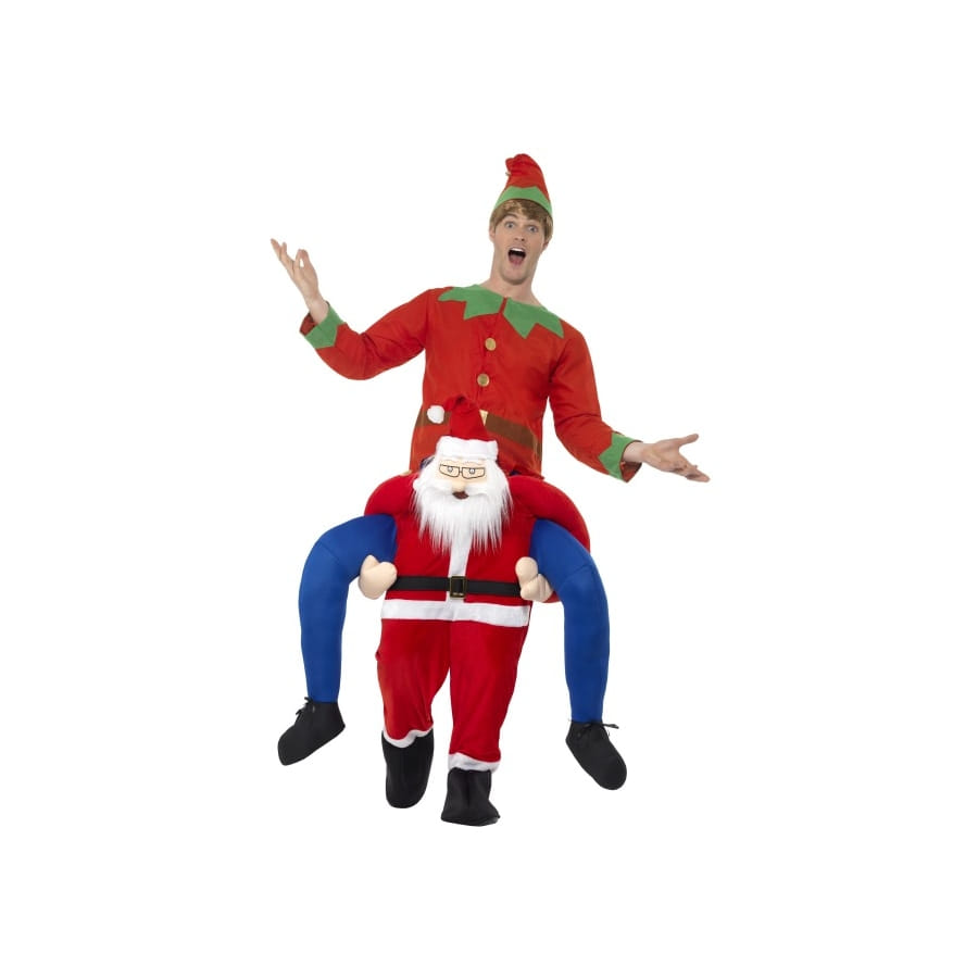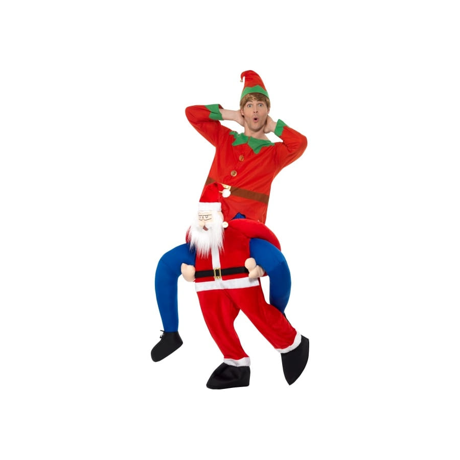 Au lieu d'enfiler le traditionnel déguisement du papa Noël, optez pour un style plus original avec ce costume à dos de père Noël. Vous aurez le privilège d'être porté sur le dos du héros des fêtes de fin d'année. La combinaison est formée par un père Noël portant un ensemble rouge et blanc des plus classiques, sans oublier sa barbe, ses lunettes et son bonnet. Il entoure de ses bras des fausses jambes de couleur bleue avec fausses chaussures noires. Vos véritables jambes seront placées dans le corps du père Noël. Comme sur la photo, vous pouvez accompagner le costume d'une chemise et d'un bonnet de lutin, ou tout simplement porter un t-shirt en dessus.