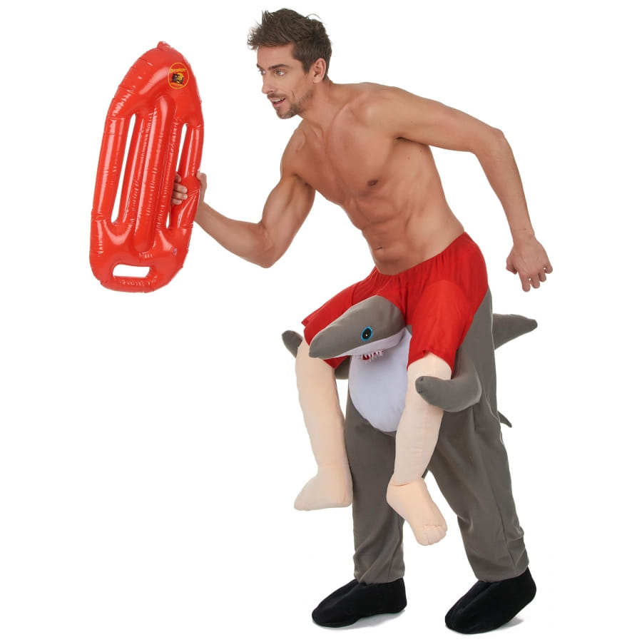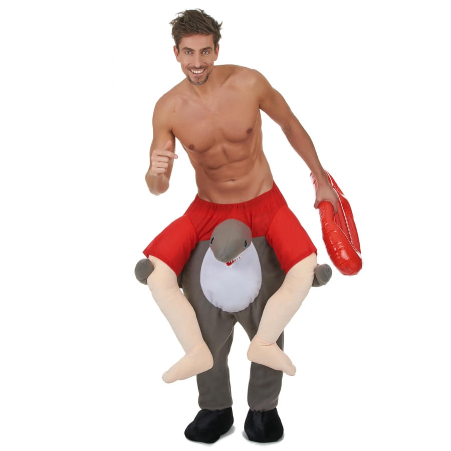 Le requin est gris blanc avec un short rouge sur les épaules.