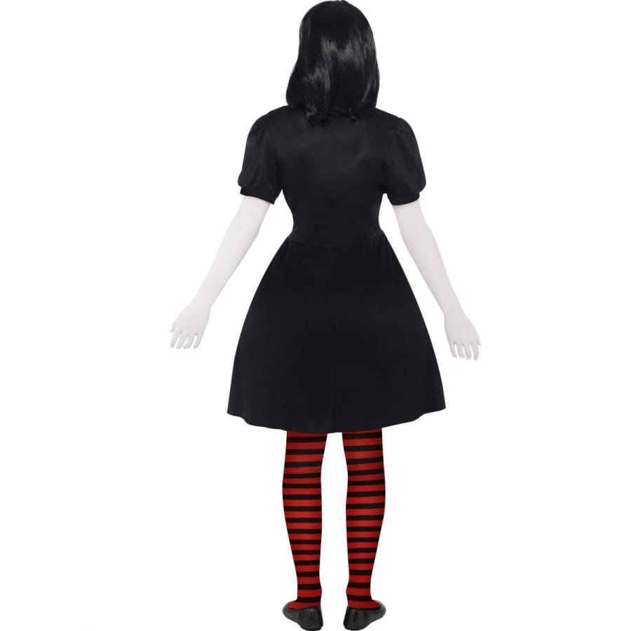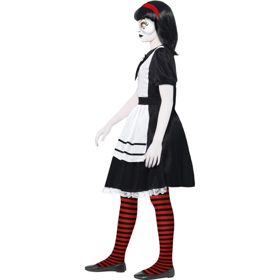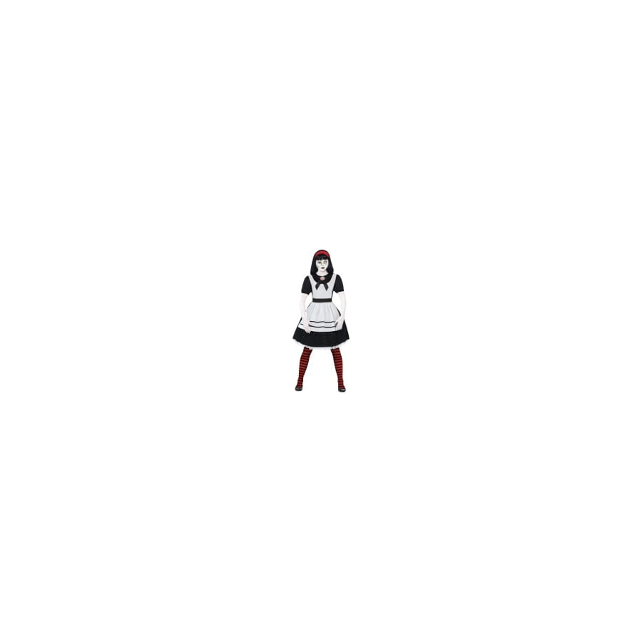 Nous pourrions appeler ce costume : déguisement Alice au pays des morts vivants. Ce produit est composé de la robe noire et du tablier blanc (les deux sont cousus ensembles), du masque de mort vivant ainsi que du serre tête rouge. Nous vous conseillons d'utiliser du maquillage corps blanc pour colorer vos bras en blanc. Des bas lignés (qu'importe la couleurs) ajouteront également une touche supplémentaire à l'ensemble.