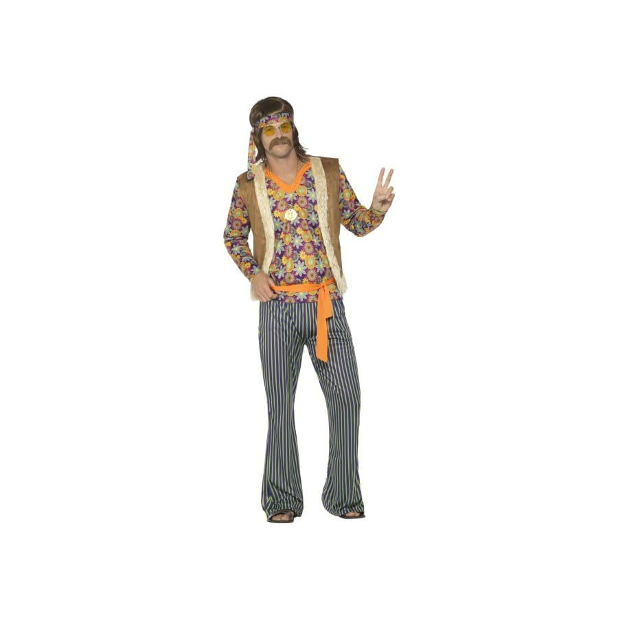 Le look hippie revient en force ! Pour avoir du style tout en restant cool et décontracté, n'hésitez pas à adopter la mode des années sixties. Le costume années 60 motifs hippie pour homme vous permettra de prôner haut et fort les belles valeurs comme la paix et l'amour. Vous disposerez d'un pantalon à rayures verticales accompagné d'un haut fleuri à manches longues. Retrouvez la joie de vivre avec ces multiples couleurs éclatantes ! Un gilet marron et beige est également fourni pour faire contraste avec les couleurs du haut. La ceinture orange doit tout juste être attachée autour de la taille. Quant au bandeau, il est également fleuri. Bienvenue dans l'univers hippie !