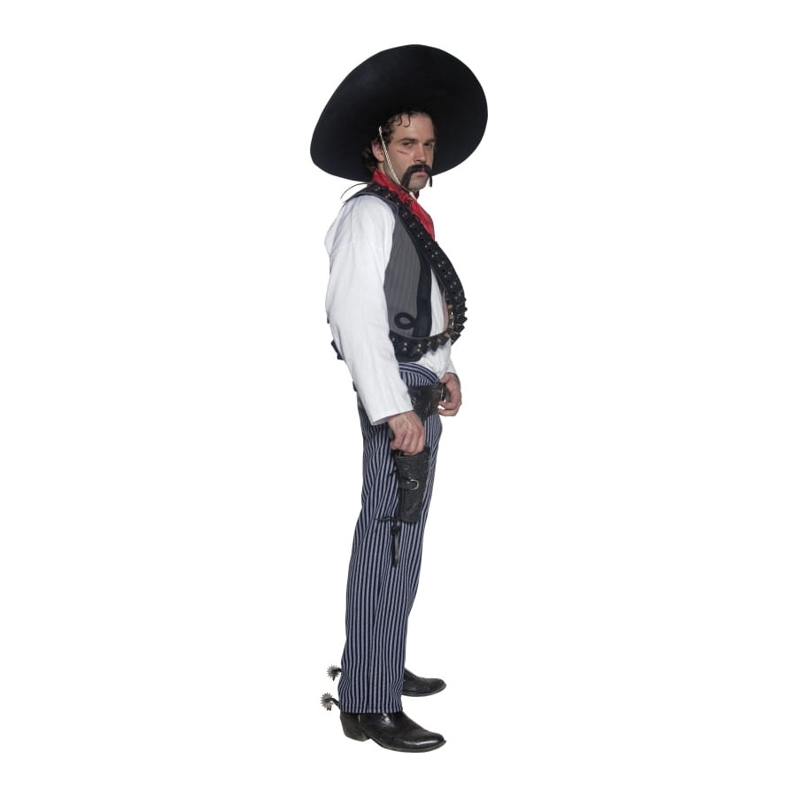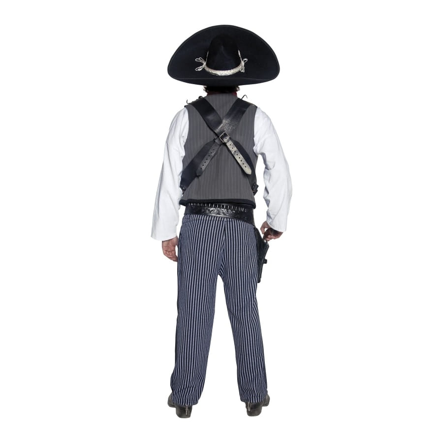 Vous aurez l'air d'un méchant avec ce costume de bandit mexicain. Pour le carnaval cessez de jouer au gentil et revêtez ce déguisement. De taille M le costume comporte une chemise blanche, un pantalon bleu et blanc, un gilet gris, un foulard rouge.