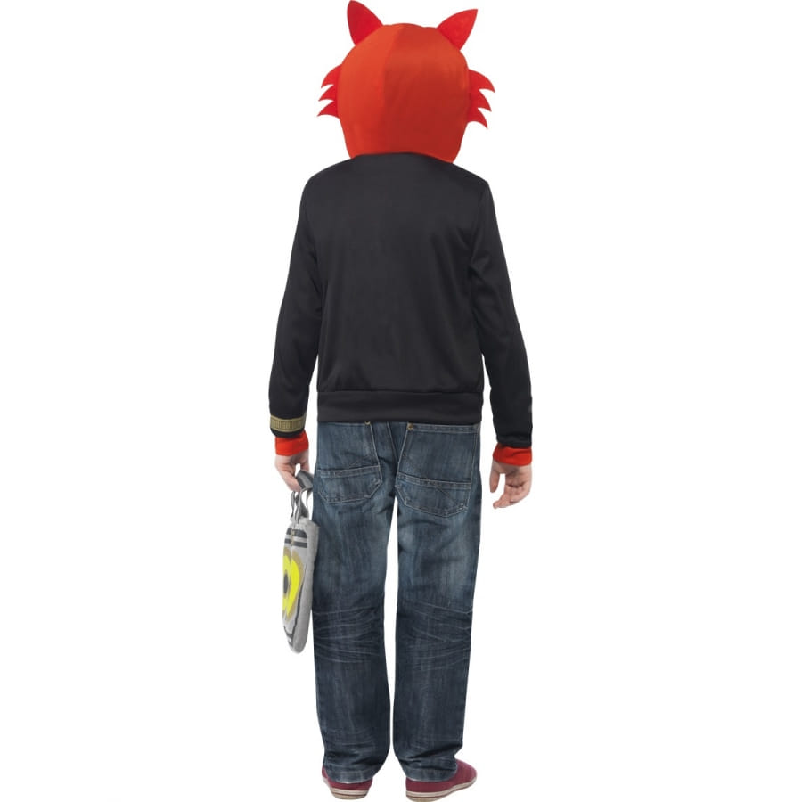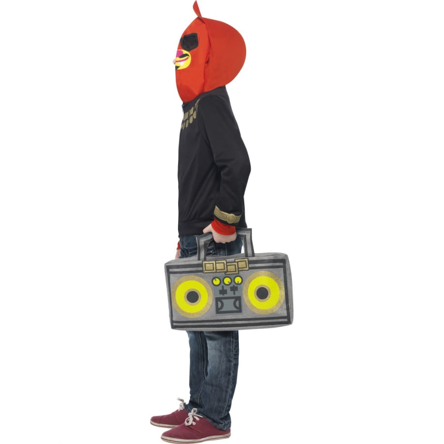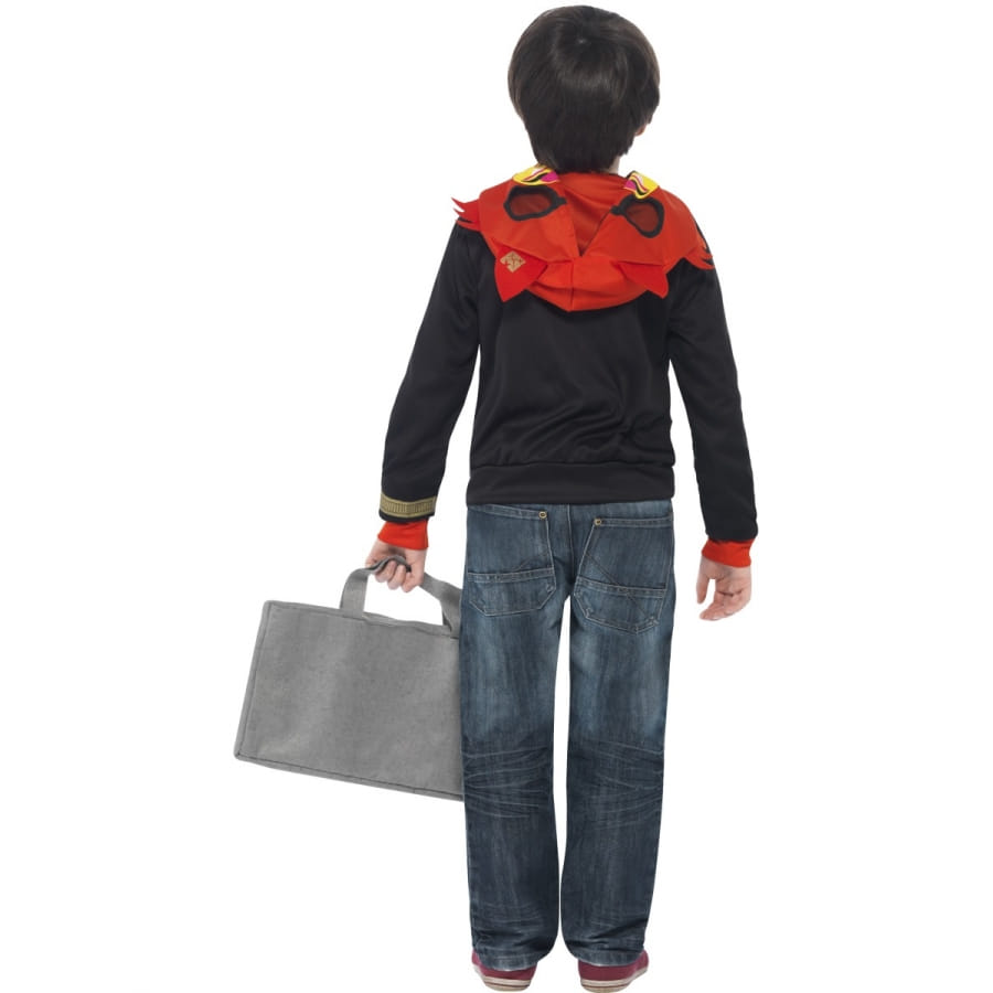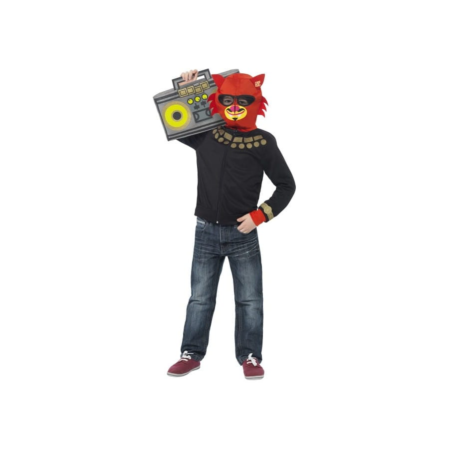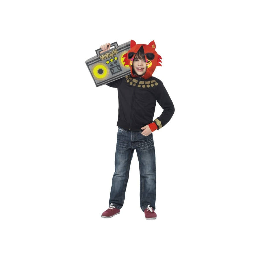 Et voilà le costume de Blingo des Moshi Monsters que vos enfants vont adorer! Il est composé d'une cagoule à zip sur le devant aux couleurs de notre renard rouge avec des imprimés noir et jaune pour les yeux et le museau. Cette cagoule est bien sûr accompagnée d'un sac rouge en forme de radio ghetto blaster de couleur grise et jaune. Petites filles et petits garçons pourront porter ce déguisement s'ils ont entre 4 et 6 ans ou 7 à 9 ans. Nettoyage à sec uniquement! Notre compagnon ne sort jamais sans ses accessoires bling-bling et son ghetto blaster!