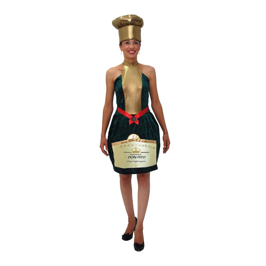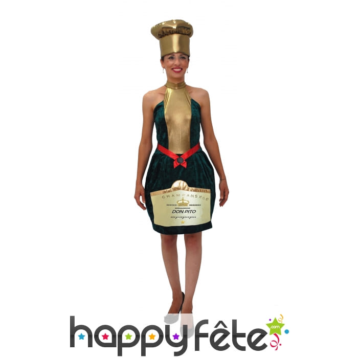Avec une petite robe en velours noir, lamée d'or et bronze au milieu, ornée d'une ceinture rouge sur la taille et de la marque du mousseux vers le bas de la robe, assortie à une coiffe dorée en forme de bouchon de mousseux, vous remporterez le prix de la tenue la plus originale.