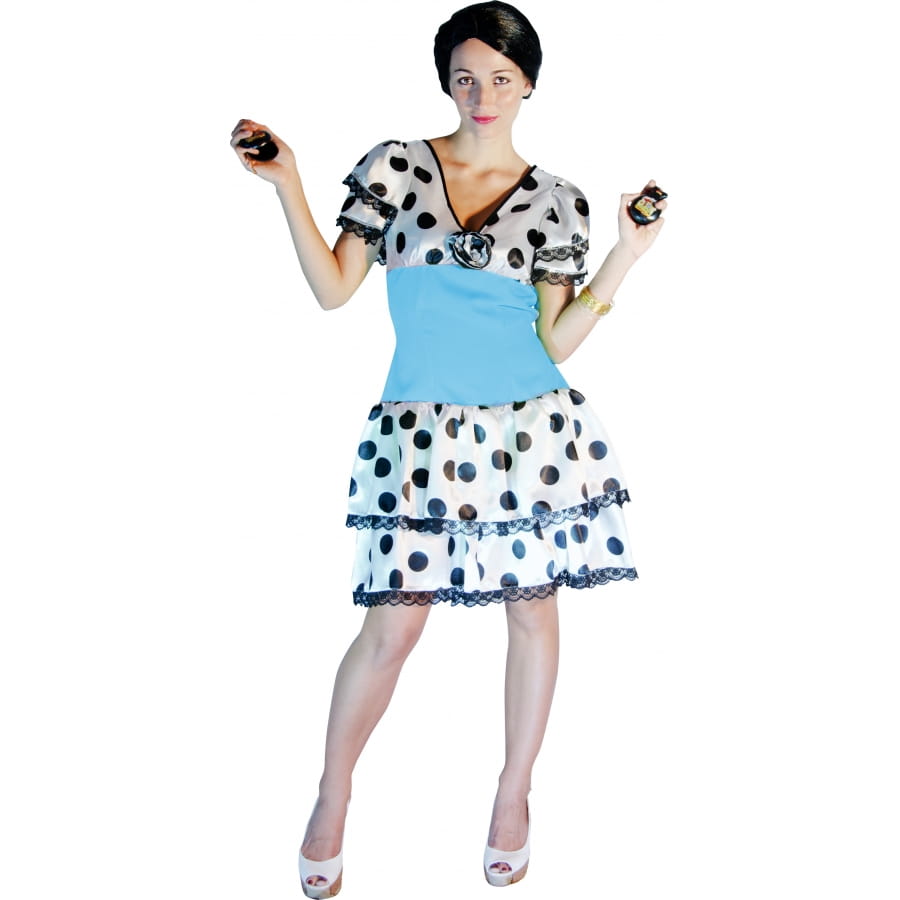 Pour le carnaval, métamorphosez-vous en danseuse dans ce déguisement. Ou si vous voulez madame vous pourrez aussi le mettre pour une fête basée sur l'Espagne ou autour du monde. Cette robe aux manches courtes avec de la dentelle, d'un col V et une petite fleur au centre. La robe arrive jusqu'aux genoux.