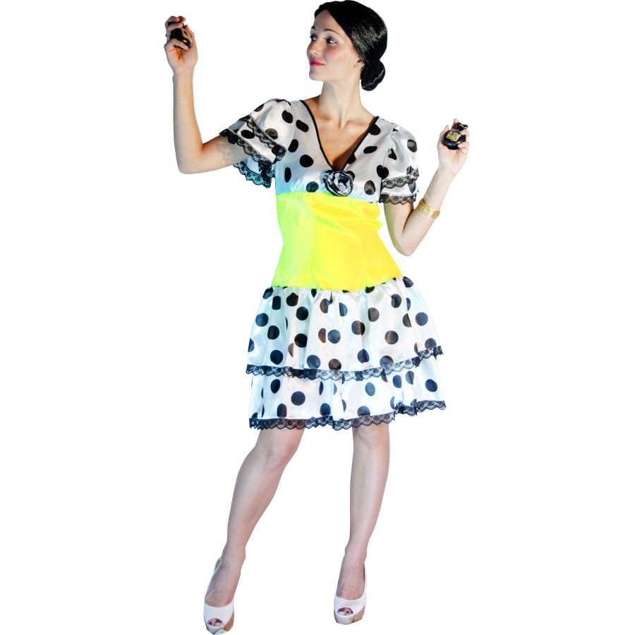 Costume d'Andalouse pour femme constitué d'une robe. Celle-ci est de couleur blanche à pois noirs avec une ceinture de couleur jaune. Elle est disponible en taille 38 ou 42-44. Elle est parfaite pour un déguisement d'Espagnole.