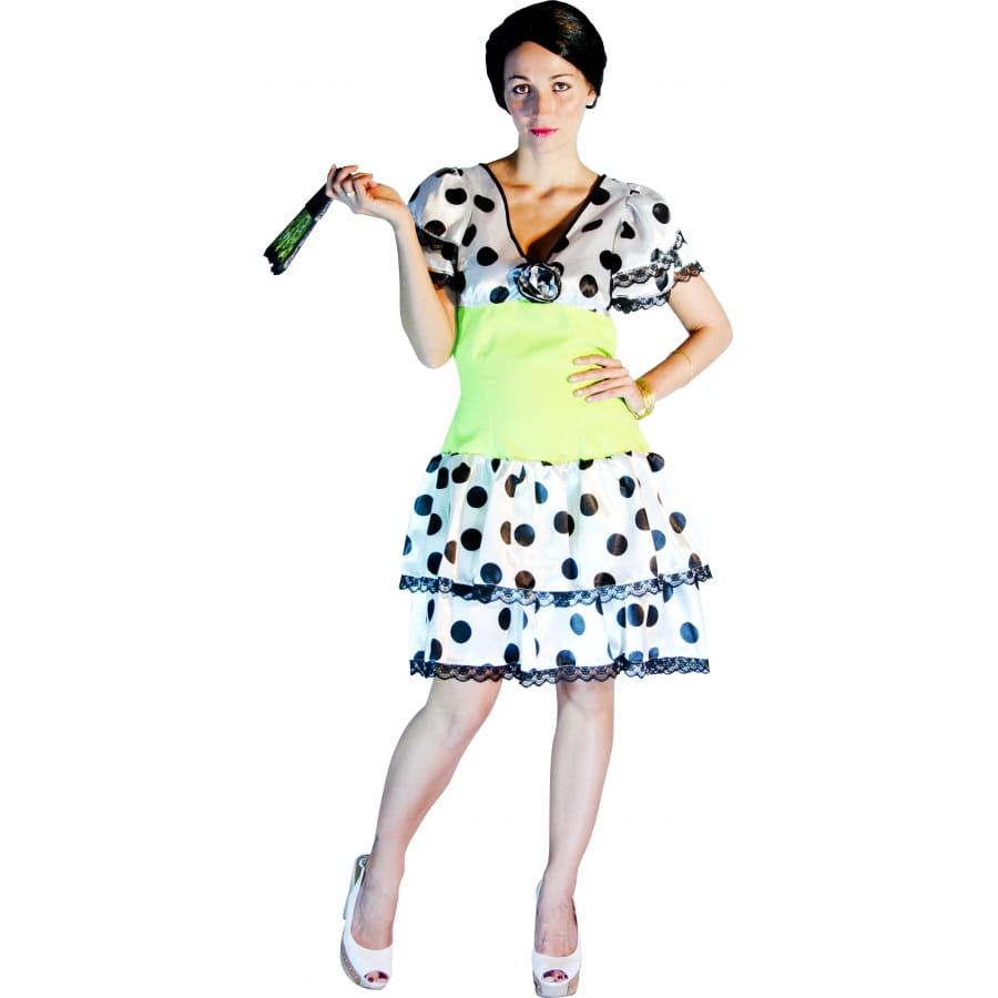 Costume d'Andalouse pour femme constitué d'une robe. Cette dernière est de couleur blanche, à pois noirs avec une ceinture verte et dentelles noires. Elle est disponible en taille 38 ou 42-44. Elle sera parfaite pour votre fête espagnole.