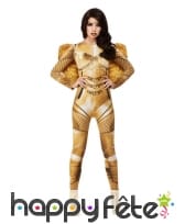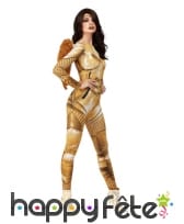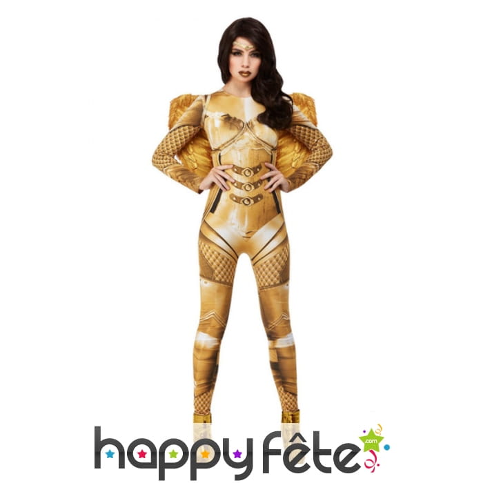 La combinaison dorée effet seconde peau est richement décorée de divers motifs.