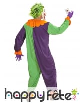 Enfin, cette tenue est complétée par un masque blanc représentant le visage d'un clown effrayant avec des cheveux synthétiques verts.