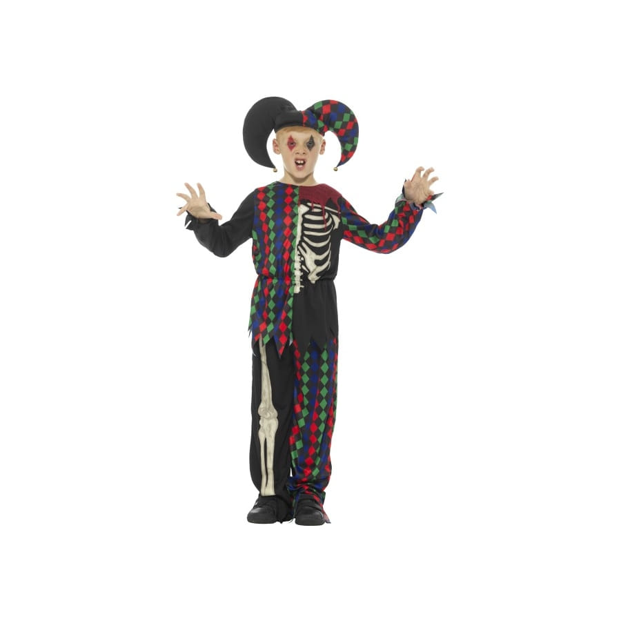 Habillez votre petit garçon en un mini bouffon pour la fête d'halloween grâce au costume d'arlequin squelette coloré pour enfant. Ce déguisement compte un ensemble pantalon et haut multicolore déchiqueté au niveau des bordures. Les motifs présents sur les vêtements sont en forme de losanges au niveau de chaque côté opposé. Quant au côté gauche du haut, la moitié d'un thorax y est dessiné. Pour le pantalon, le côté droit a des os du fémur et du tibia d'un squelette humain peints dessus. Un chapeau vient aussi s'ajouter au costume d'arlequin squelette coloré pour enfant. Egalement multicolore, le couvre-chef se trouve doté de grelots disposés sur les deux bouts.