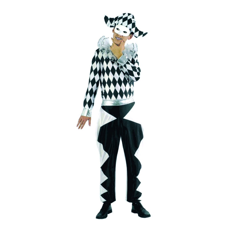 En arlequin, vous serez unique et amusant. Vous serez élégant et mystérieux dans ce costume de bonne qualité qui existe en deux tailles : 50/52 et 54/56. Ce costume est composé d'un pantalon blanc, d'une chemise qui a un col volant en tulle de couleur noir, blanc et argent. D'une coiffe de la même couleur et vendu sans masque.