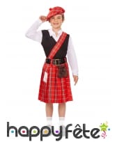 Elle possède des motifs à tartan rouge et s'accompagne d'une écharpe de la même couleur, mais avec une extrémité à franges blanches.