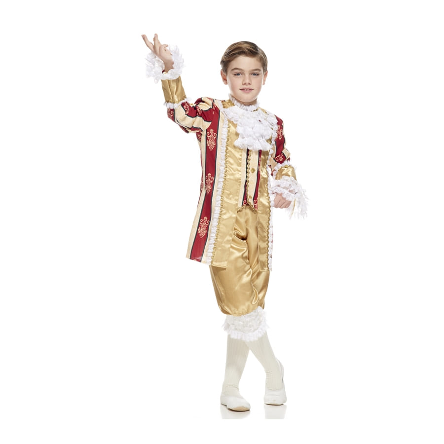 Posséder un titre de noblesse à une époque impliquait une certaine distinction dans le code vestimentaire. Bénéficiez d'un petit cours d'histoire de la mode à travers ce costume d'élégant petit marquis. A porter pour les grandes occasions où le déguisement est de rigueur, ce costume destiné aux petits garçons coquets va faire sensation ! Il comprend une veste à manches longues et un pantacourt de couleur assortie. Retrouvez l'association de l'or et bronze et du rouge à travers cet ensemble. Un jabot de couleur blanche vient agrémenter le col de la veste pour une allure plus stylée. Procurez-vous le déguisement selon la taille de votre enfant. L'article est proposé pour les garçons de 5 à 11 ans.