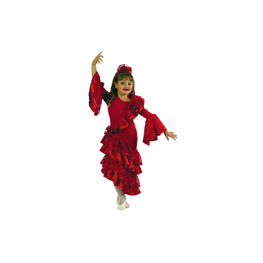 Ce déguisement transformera votre fille en véritable demoiselle espagnole spécialiste de la danse. Elle fera trembler la piste de danse dans ce déguisement. Elle pourra le porter pour le carnaval ou une autre fete déguisée. Tout le monde dira : Olé à cette danseuse de flamenco. Ce costume est composé d'une robe rouge avec dentelle rouge et or. Ainsi qu'une coiffe de la meme couleur .