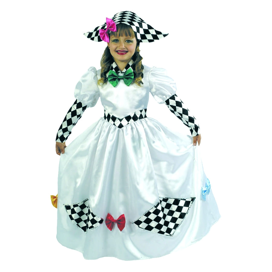 Elle sera resplendissante dans ce costume d'Arlequine, votre petite fille aura le costume original qu'elle cherche. Ce costume est parfait pour les fetes ayant pour thème le cirque ou même l'enfance. Cet ensemble est composé d'une robe manche longue blanche , noir avec un noeud rouge, bleu et jaune ainsi que d'une coiffe de la même couleur . Il est aussi composé d'un noeud papillon vert.