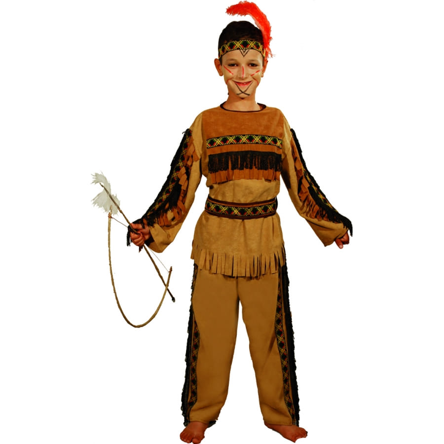 Il sera l'indien le plus adorable dans cette tenue. Votre fils aura l'attention de tout le monde dans ce magnifique déguisement de bonne qualité. La tenue est composée d'un bandeau multicolore avec une plume rouge sur le coté, d'une tunique avec franges, d'une ceinture multicolore et d'un pantalon avec des bandes noir sur les cotés.