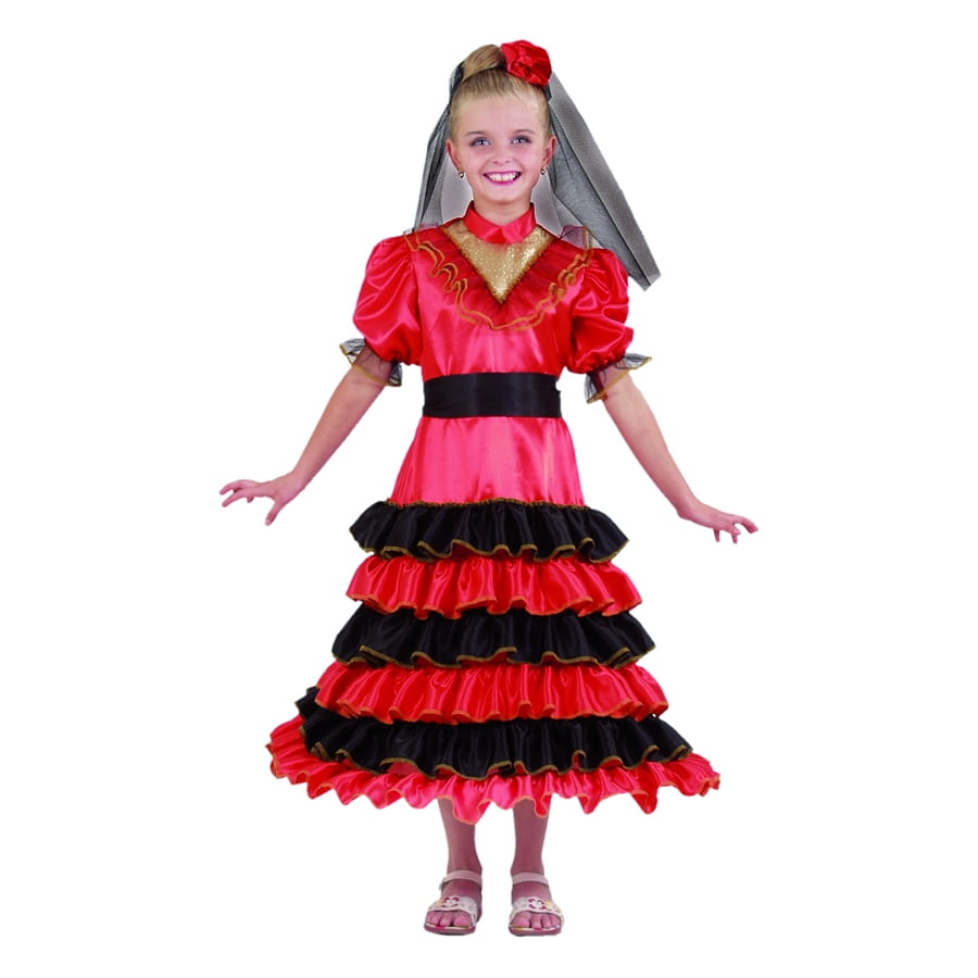 Elle sera la plus belle des Espagnoles dans ce déguisement. Pour un goûter d'anniversaire ou même durant le carnaval, elle sera la plus jolie des petites fille dans ce costume Marguerita. Elle peut incarner le personnage d'une danseuse dans ce déguisement. Ce costume est composé d'une robe rouge à volant noir avec bordure doré et d'une coiffe, c'est un bandeau et de la dentelle noire avec une rose rouge sur le coté.