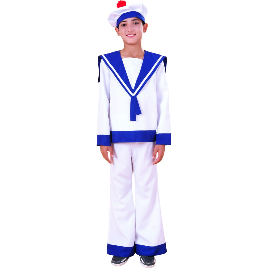 Votre enfant sera ravis dans ce déguisement de marin, de taille 116. Il pourra le porter durant un anniversaire ou même le carnaval. Il incarnera un marin dans ce déguisement , qui est composé d'un pantalon blanc avec bordures bleu , d'une tunique blanc et bleu. Il est aussi composé d'une coiffe avec un pompon rouge dessus.