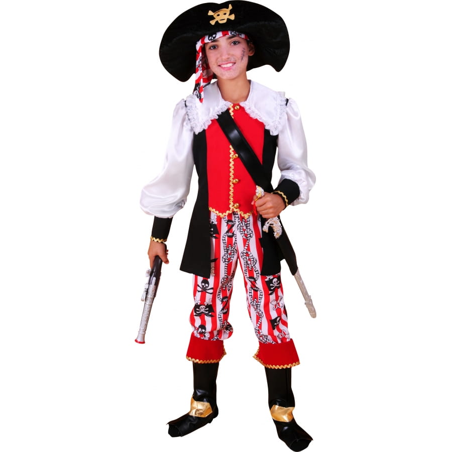 Votre enfant ira à l'abordage dans ce magnifique costume de pirate Avir. Il sera vraiment heureux dans ce costume il se sentira comme un véritable pirate dans ce déguisement. Disponible en taille 116 pour les enfants de 4 à 5 ans. Il pourra porter ce déguisement pour un anniversaire ayant pour thème enfance et pirate. Il est composé d'une veste noire, un pantalon rouge, blanc et noir avec des motifs de tête de mort dessus. Une coiffe avec une tête de mort dessus et de surbottes.
