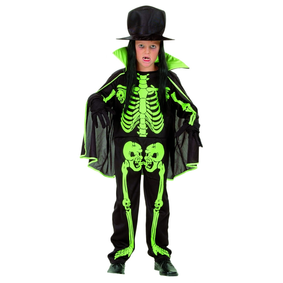 Voici venue une créature qui adore sortir pendant les nuits d'Halloween ! En effet, le squelette est souvent présent lorsqu'il s'agit de déguisement pour Halloween. Cette fois-ci, ce sont les petits garçons qui ont la chance de se débarrasser de leur peau, afin de vêtir quelques os ! Découvrez un fabuleux costume d'enfant squelette. Il est constitué par une longue combinaison noire décorée d'os et de têtes de morts disposés à la façon squelette. Les fameux os sont de couleur vert fluo pour éviter d'être inaperçus. Mais ce n'est pas tout ! Pour agrémenter l'ensemble, une cape aux couleurs assorties est aussi fournie, ainsi qu'un gros chapeau. Il est à noter que quelques faux cheveux sont accrochés sur le chapeau pour que votre fils soit méconnaissable ! Ce déguisement inédit existe en différentes tailles pour les enfants âgés de 7 à 9 ans et ceux de 10 à 12 ans.