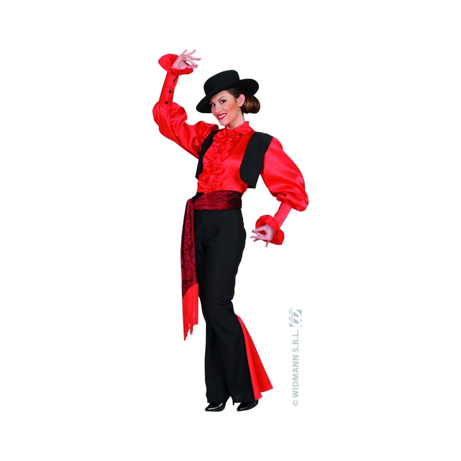 Set de déguisement espagnol, pour femme, composé d'une ceinture, d'une chemise, d'un pantalon et d'un chapeau. Cet ensemble noir et rouge est disponible en taille M, L ou XL. Il est parfait pour se déguiser en danseuse espagnole.