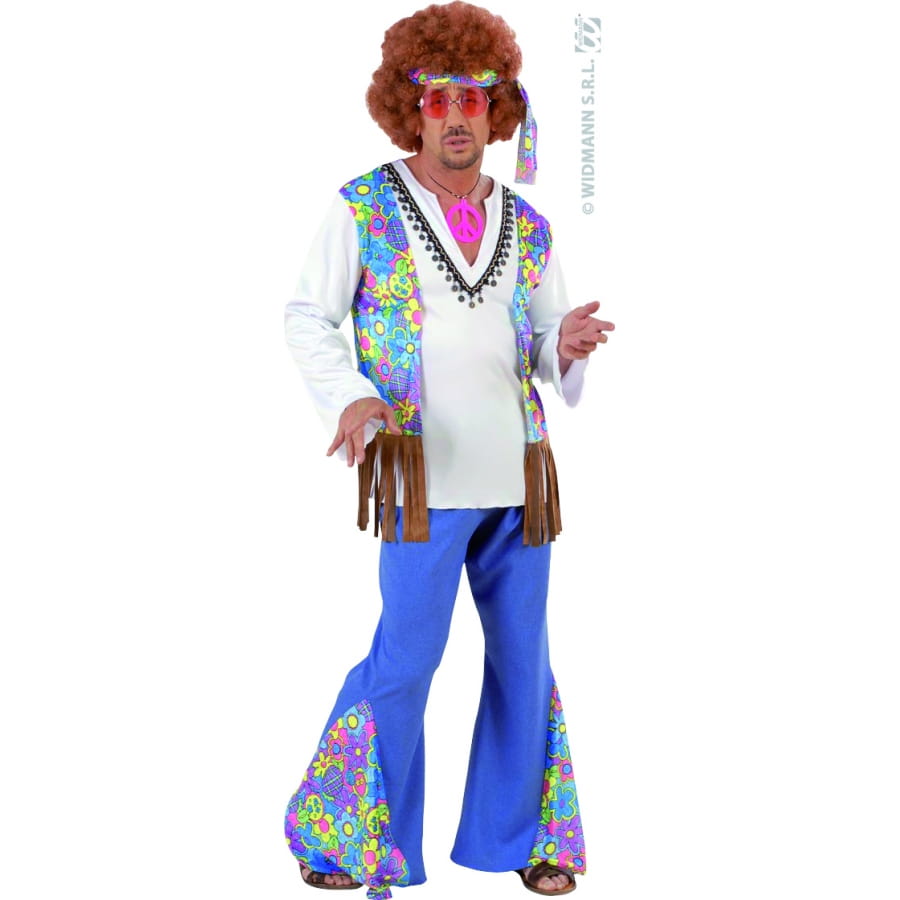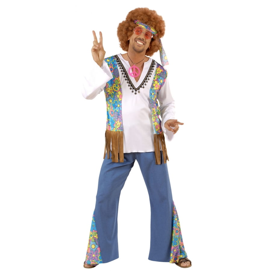 Set de déguisement de hippie, pour homme, composé d'un pantalon, d'un serre-tête et d'une chemise cousue avec gilet. Cet ensemble multicolore est disponible en taille L/M/XL/. Il est parfait pour se déguiser en hippie de Woodstock.