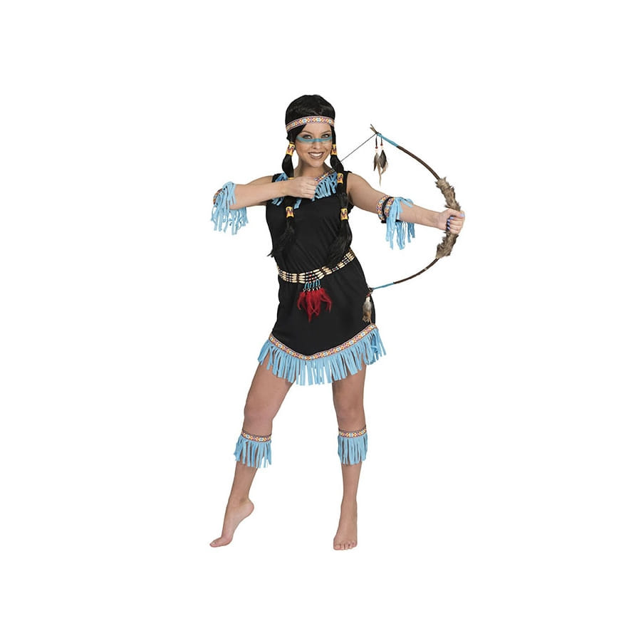 Ce Costume d'indienne avec franges bleues se compose d'une robe, de 2 tours de bras, de 2 tours de mollets et d'un bandeau.