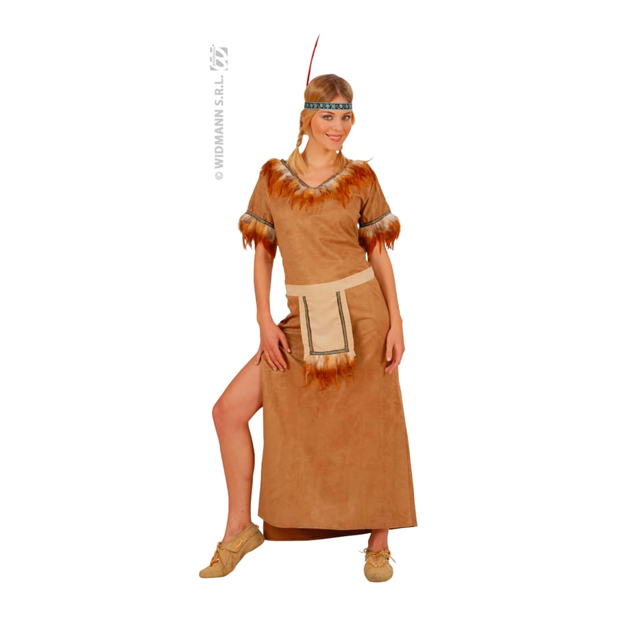Rendez-vous à la prochaine soirée déguisée en Indienne d'Amérique, le costume comprend un tablier, une robe et un serre-tête avec plume. Cet ensemble beige et marron en suédine est disponible en M, L ou XL. Il est parfait pour se déguiser en Indienne d'Amérique traditionnelle.