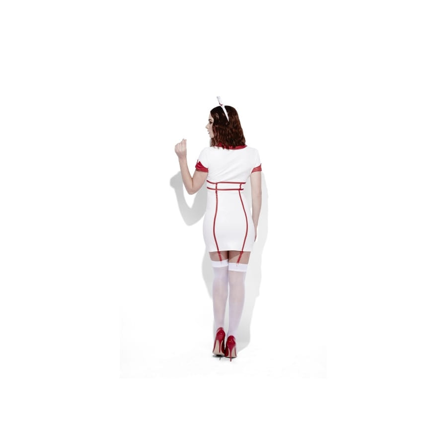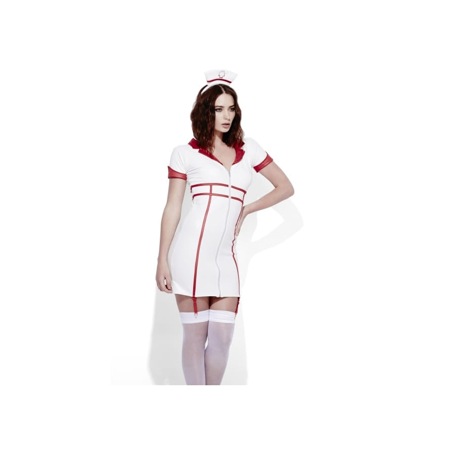 Voici un costume d'infirmière super sexy, composé d'une robe, d'une coiffe et de jarretelles. La robe est blanche, assez courte, près du corps et se ferme par une fermeture à l'avant, ce qui vous permettra de choisir le décolleté que vous souhaitez. Des rubans rouges sont cousus parallèlement au bas de la robe, à l'avant et à l'arrière, ainsi qu'au niveau de la taille. On retrouve également des touches rouges au niveau du col et des manches. La coiffe est assortie à la robe avec une croix imprimée sur le devant. Des jarretelles détachables sont également comprises dans cette tenue pour y apporter plus de charme. Ce déguisement pour femmes est disponible en tailles : L/ M/ S/ XS. Vous pourrez ainsi vous tenir prête pour toutes sortes d'interventions lors de vos fêtes déguisées ou à l'occasion de la Saint Valentin, pour des jeux de rôle coquins.