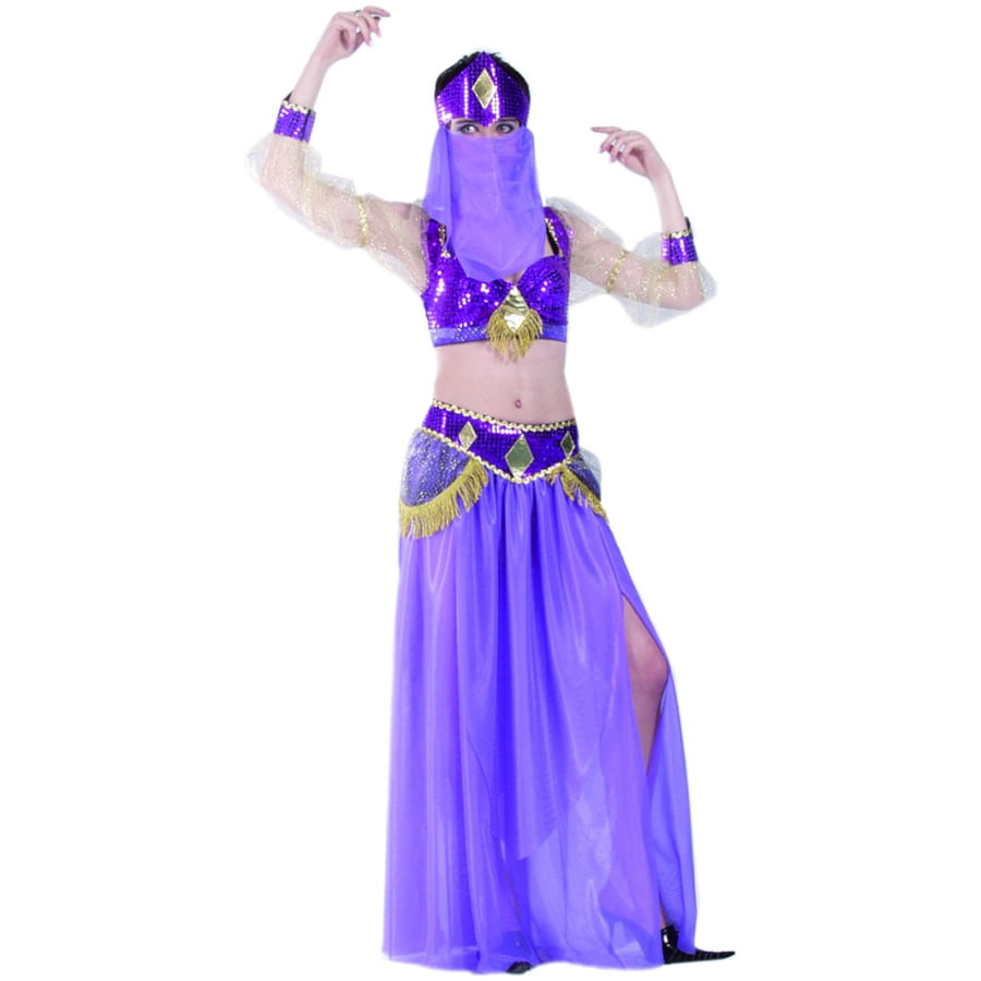 Vous serez envoûtante dans ce costume de danseuse orientale, tout le monde sera envoûté par votre charme. Ce déguisement est composé d'une jupe avec fendu, d'un top et d'une coiffe pailletée. De couleur violet, or et bronze. Vous ferez une parfaite princesse de l'orient dans ce déguisement qui est disponible en deux tailles: 38/40 et 42/44.