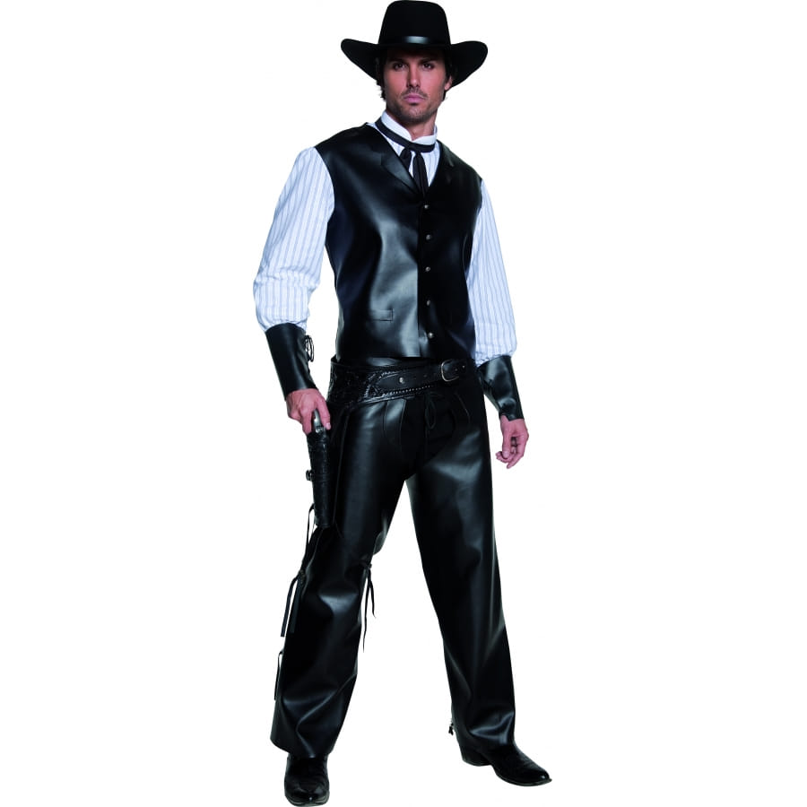 Set de déguisement Western, pour homme, composé d'une lavallière, de chaps et d'un gilet avec chemise cousue. Cet ensemble est parfait pour se déguiser en bandit ou en policier de l'ouest pour un carnaval Western.