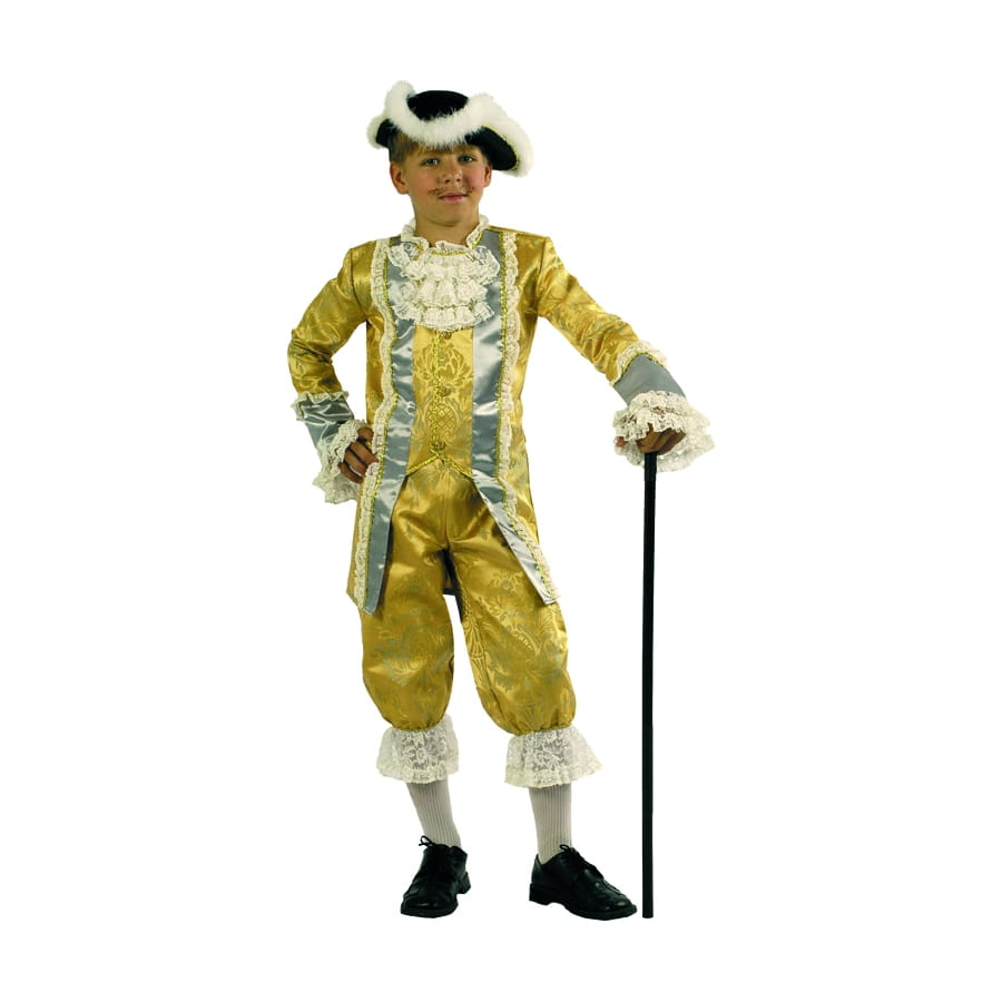 Tout votre entourage sera ébloui à l'arrivée de votre fils qui sera déguisé en marquis dans ce beau costume. On lui fera la révérence et il sera respecté de tous. Ce déguisement de marquis peut être aussi porté pour incarner le personnage d'un aristocrate ou durant une fête d'anniversaire ou une fête ayant pour thème Historique. Ce costume est composé d'un pantalon et avec de la dentelle au bas. Il est aussi composé d'une veste avec de la dentelle. De couleur argent, or et bronze ce costume est proposé en taille 116,128,140,152 et 164.