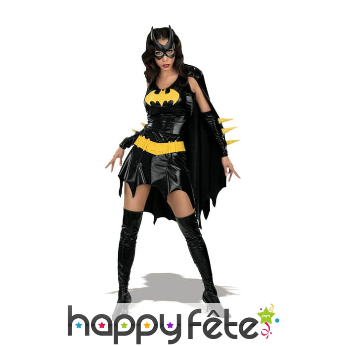 Set de déguisement de super héros sous licence, pour femme, composé d'une robe avec cape, d'une ceinture, d'un masque, d'une paire de manchettes et de surbottes en vinyl. Cet ensemble jaune et noir est disponible en XS, S ou M. Il est la réplique parfaite du déguisement de Batgirl!