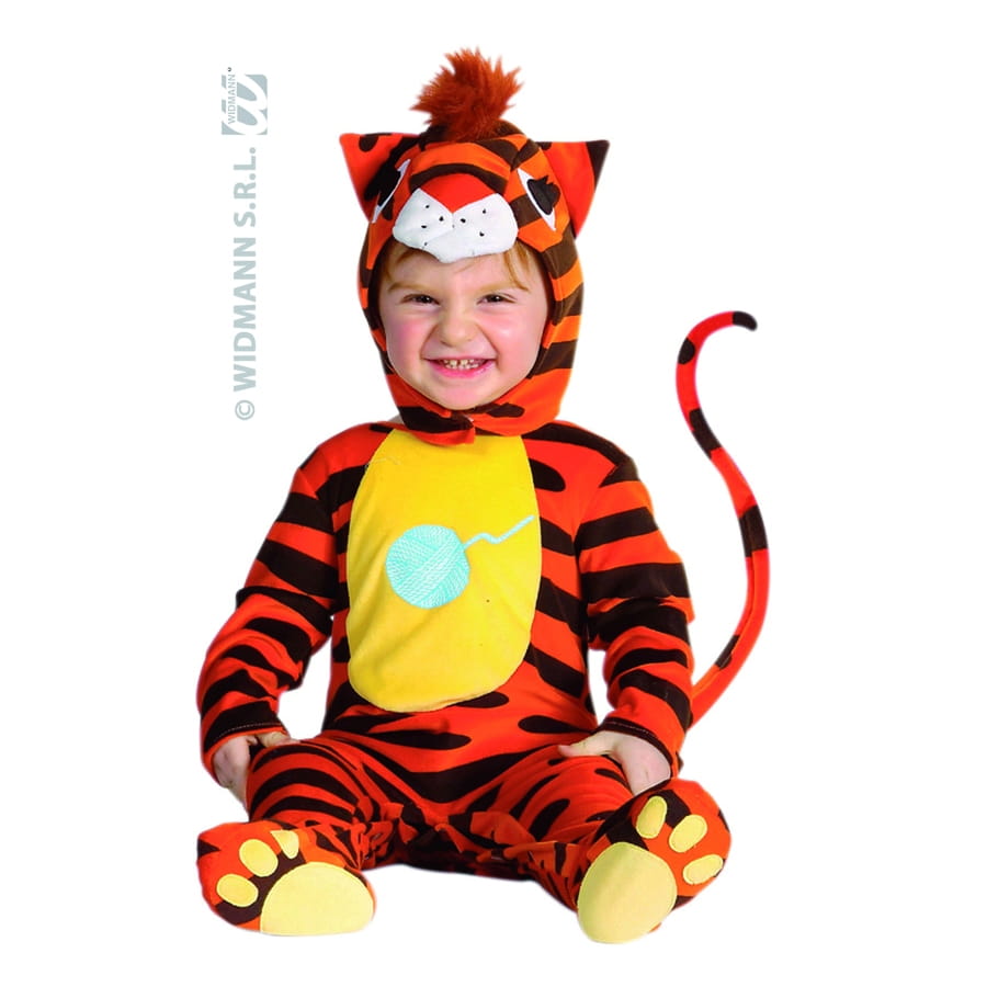 Minou, minou, minou. Une combinaison et d'une coiffe de chat jaunes, noires et orange. La taille de la combinaison est de 90 centimètres avec entre-jambe ouvrable. Avec ce déguisement, votre enfant sera le portrait craché de Tigrou!