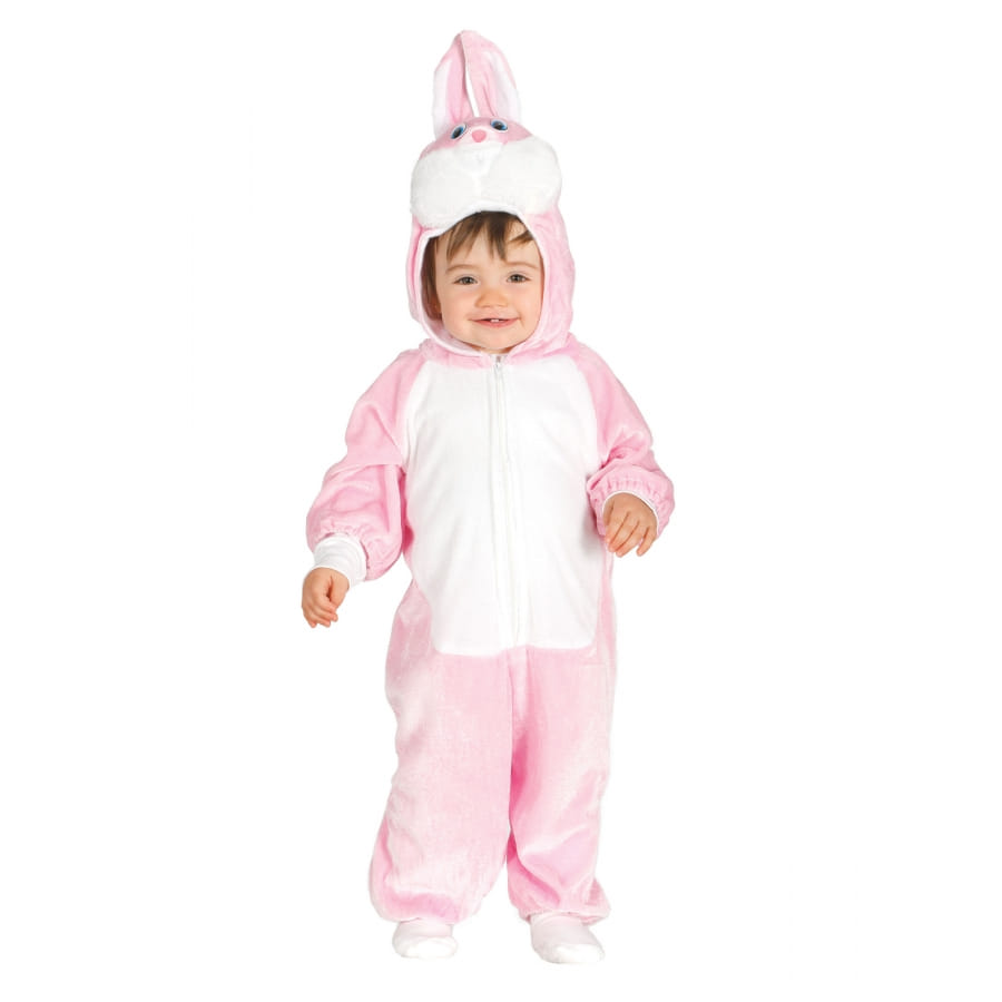 C'est une combinaison à capuche représentant un lapin rose avec le ventre de couleur blanc.