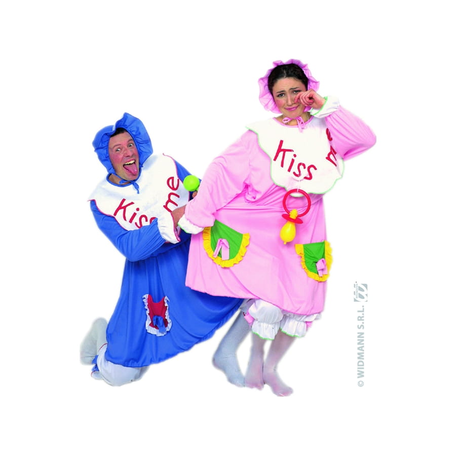 Vous adorez rigoler, revêtez ce costume de bébé unisexe de couleur rose ou bleu, vous allez provoquer un fou rire et beaucoup de gaieté lors de votre prochaine soirée. Le déguisement comporte une robe, un bavoir, un pantalon et un bonnet. Existe en taille S, L ou M.