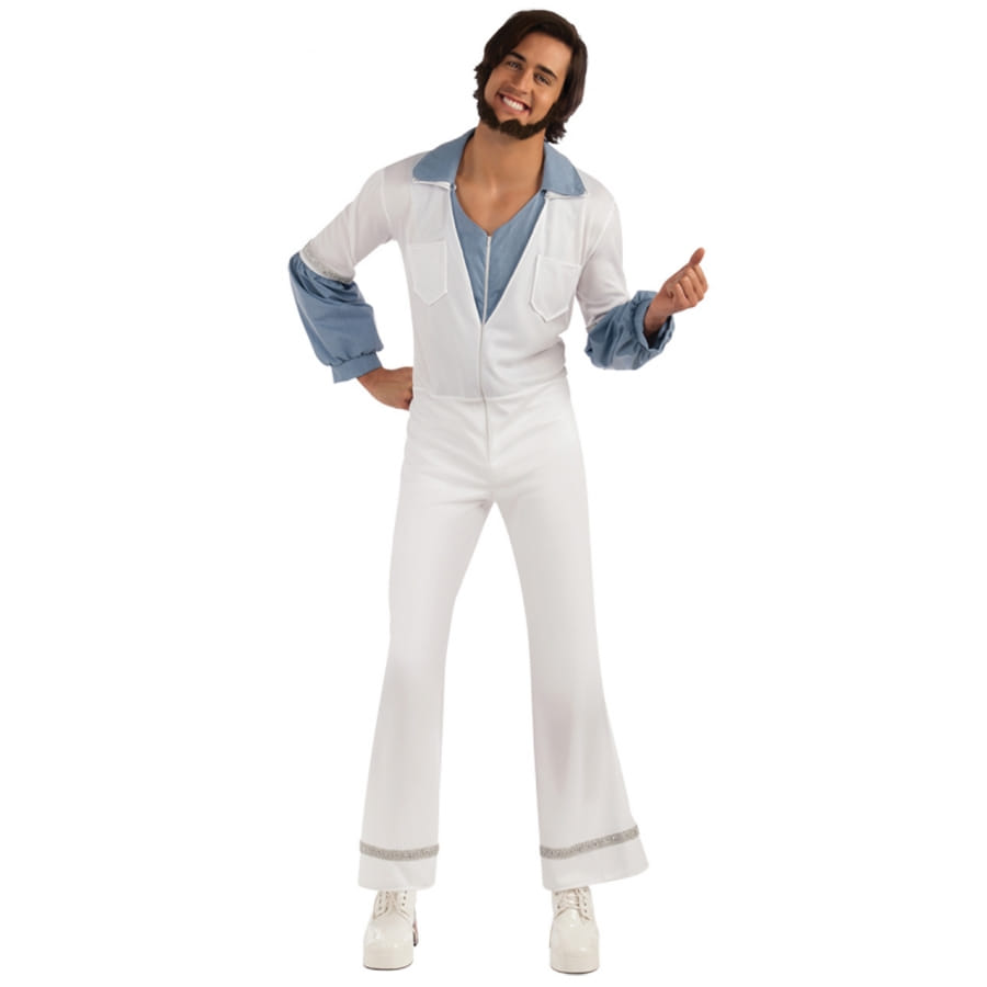 Pour les fans de Abba, choisissez ce costume de Benny, Abba pour adulte pour incarner le temps d'une soirée une célébrité. Il est composé d'un combi-pantalon blanc avec un col chemisier, doublé d'une chemise bleue cousue à l'intérieur. Les manches sont blanches jusqu'aux coudes et le bord est orné de liseré argenté, le reste constitue les manches du chemisier bleu. La combinaison est munie de deux poches de chaque côté de la poitrine et d'une fermeture éclair devant facilitant l'ouverture. Le pantalon patte d'éléphant est décoré de liseré argenté sur le bas. L'ensemble est en tissu léger et souple, ce qui le rend très confortable à porter.