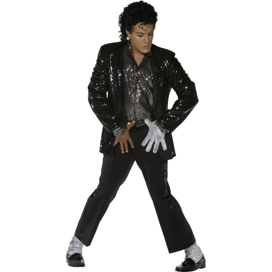 Costume de Michael Jackson dans le clip vidéo "Billie Jean" pour homme, composé d'une veste noire, d'une chemise grise, de chaussettes et d'un gant blancs, tous paillettés. Cet ensemble est disponible en taille S, M ou L. Revivez les meilleures années de la Pop avec ce déguisement!
