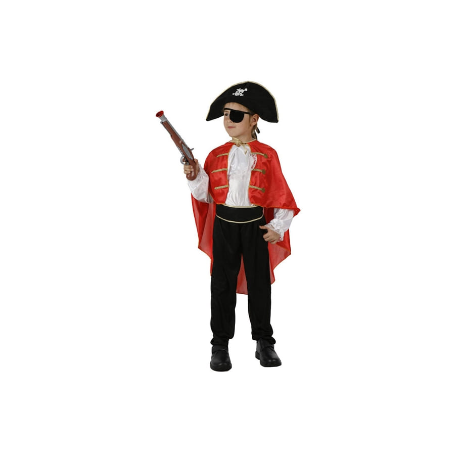 Le pirate reste un grand classique quand il s'agit de déguisement pour enfant. Ici, on propose à votre petit garçon d'incarner le maître du navire avec ce costume de capitaine pirate pour garçon. La tenue se compose d'une combinaison comprenant un haut blanc avec une partie en voile au niveau du col, et le bas en noir. Elle contient également une cape rouge dont la partie supérieure donne l'effet d'un gilet, un cache-oeil noir pour bien se glisser dans le personnage, et un chapeau noir livré avec un autocollant de tête de mort. Notre modèle est munit d'un faux pistolet et d'une ceinture de pirate, des accessoires que vous pourrez retrouver parmi les accessoires du site.