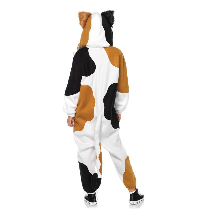 Le costume de chat tacheté pour femme est une combinaison qui représente un adorable chat blanc aux tâches marron et noires.