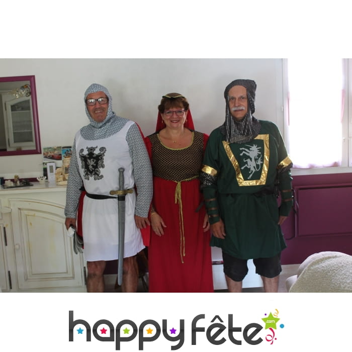 Enfilez ce costume de chevalier premier prix pour ressentir la fierté de ceux qui ont un jour combattus pour leur royaume. Proposé pour les hommes de tailles L, M et XL, ce déguisement est composé d'un long top de couleur blanche avec des manches grises dont le motif rappelle les cotes de mailles, muni d'un emblème sur le torse et d'une cape de couleur rouge qui y est attachée, d'une ceinture de couleur noire et d'une coiffe dont la couleur et le motif sur le tissu est identique à ceux des manches du top. A vous de compléter le reste du costume avec un pantalon et une paire de bottes. N'oubliez pas votre épée et votre bouclier.
