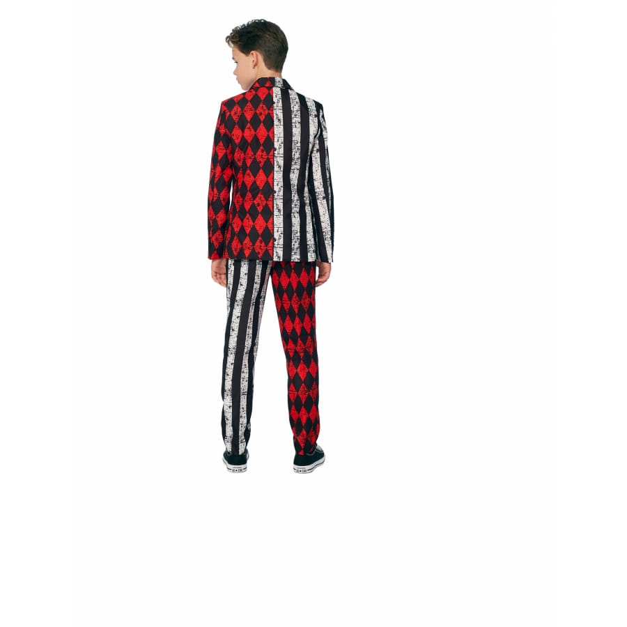 La cravate quant à elle est décorée d'un damier de carreaux rouges et noirs.
