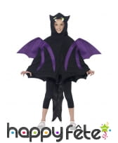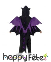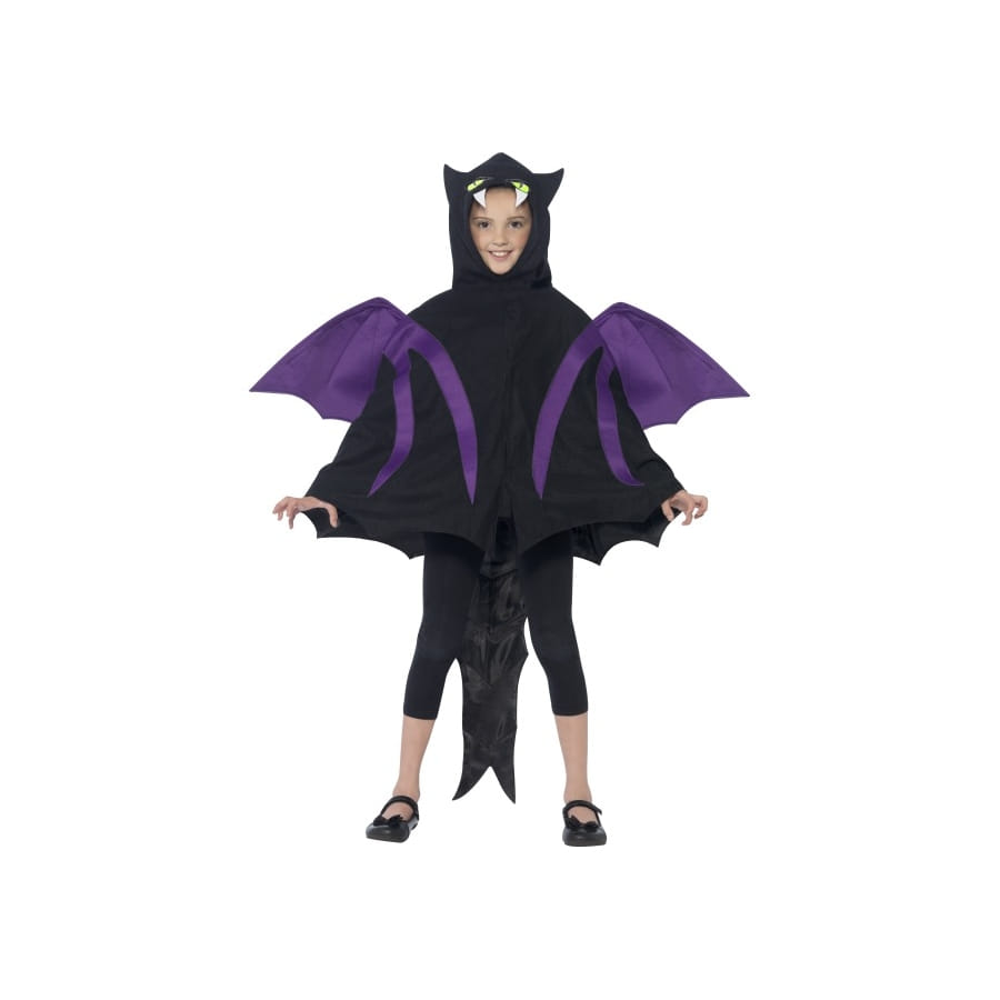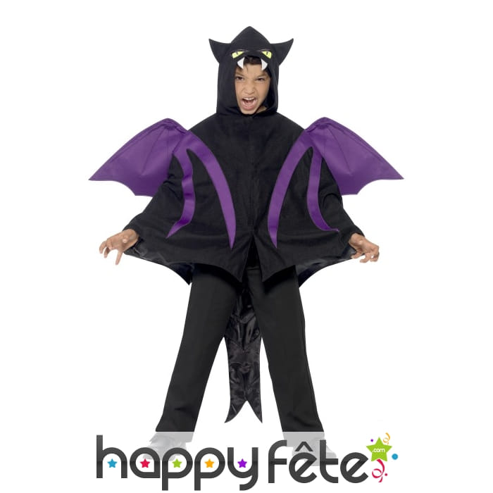 Halloween est une occasion favorable pour tous, et pour les enfants en particulier, d'incarner toutes sortes de monstres, le but principal étant de faire peur aux autres. Ainsi, nous vous proposons ce costume de créature des bois insolite, composé d'une cape toute en noire, avec une capuche recouvrant la tête et formant des espèces de cornes sur le dessus du front. La cape possède en outre des ailes violettes et une longue queue noire pour le côté créature. Cette tenue fera plaisir à vos enfants, petit garçon ou petite fille, dont les tailles sont : 7/12 ans et 4/7 ans. Rajoutez-leur un simple pantalon noir, et de fausses dents de notre section accessoires pour compléter le déguisement.
