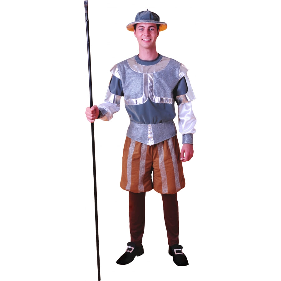 Set médiéval, pour homme, composé d'une veste, d'un collant, d'un pantalon, d'une chemise et d'une coiffe. Cet ensemble multicolore est disponible en taille 50/52 ou 54/56. Il est parfait pour se déguiser en Don Quichotte.