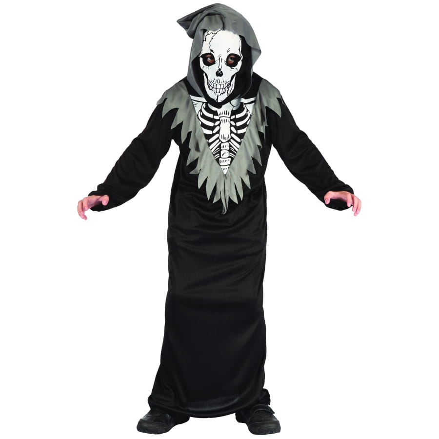 Prédestiné aux garçons, le déguisement est fait d'une longue robe noire à manches longues, présentant un squelette sur la poitrine et des lamelles de tissus grises.