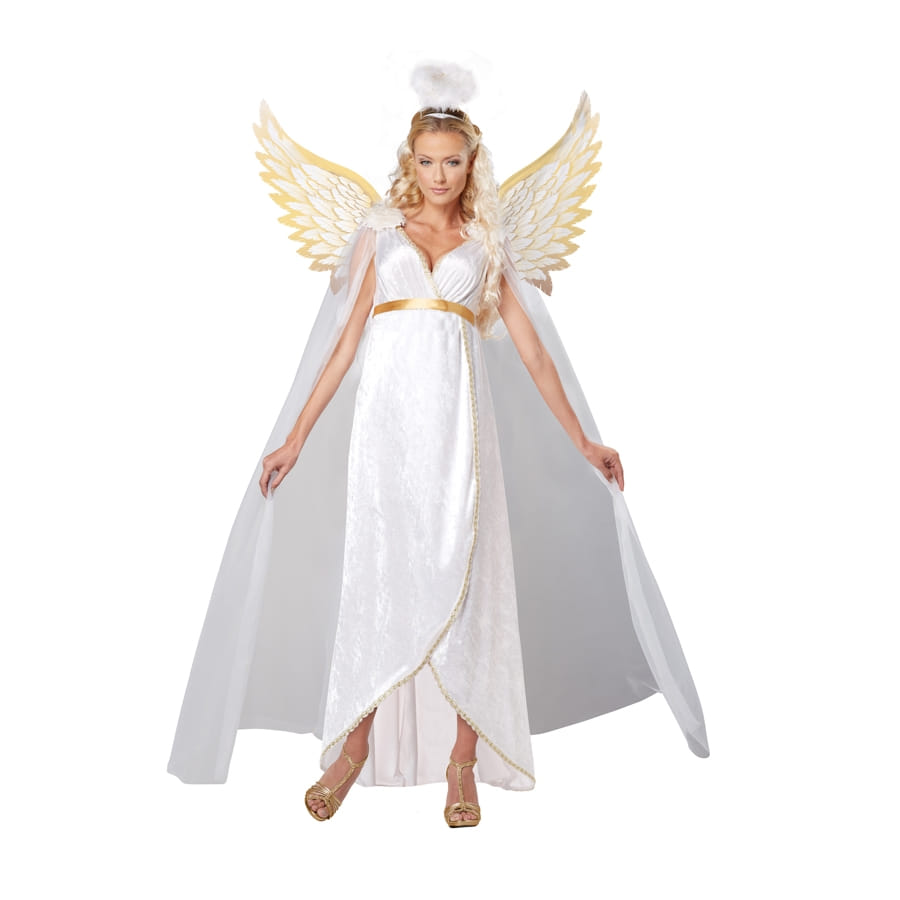 Il est composé d'une robe longue blanche avec de magnifiques bordures dorées, d'une cape en voile blanc attachée sur des épaulettes en plumes détachables, d'une paire d'ailes blanches et dorées, et d'une auréole, la touche finale et l'indispensable accessoire d'un ange.