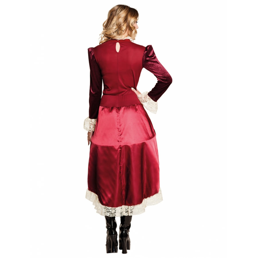Enfin, les longues manches bordeaux sont faites dans un tissu effet velours agrémenté par une fine dentelure blanche cousue sur l'extrémité.