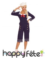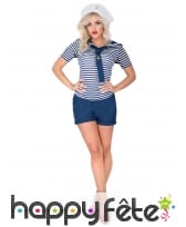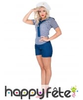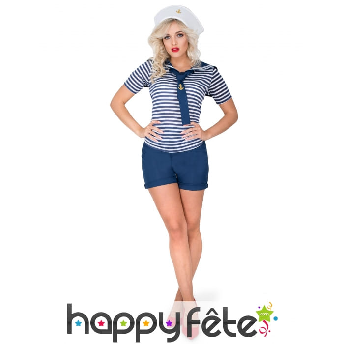 La cravate est bleu marine comme le short mini et dispose d'une ancre dorée qui orne également le grand chapeau de marin blanc.