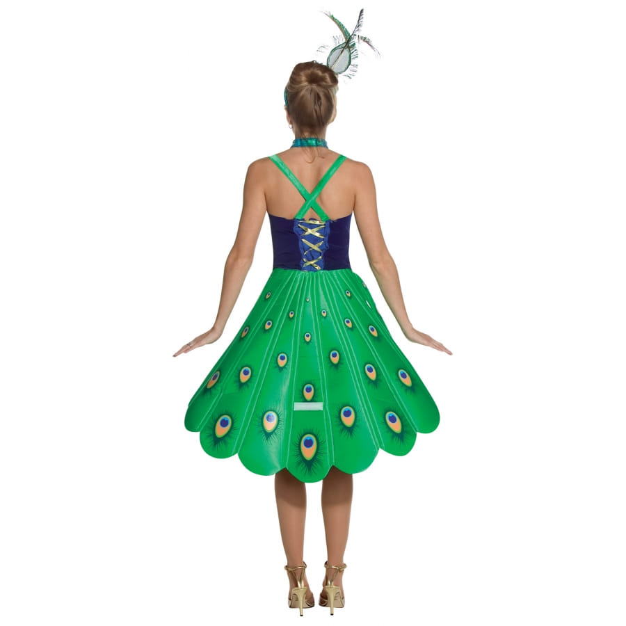 Faites une entrée spectaculaire dans votre costume de femme paon avec queue en éventail. Vous serez loin de passer inaperçue dans votre superbe robe imprimée conçue dans un tissu soyeux et étincelant. Un corsage a été intégré au dos du vêtement pour mieux ajuster votre taille. L'effet bouffant est obtenu grâce à un élastique placé en bas de la robe. Il s'agit d'un modèle à bretelles, bleu et vert, rappelant les magnifiques couleurs du paon. Une queue en éventail de couleur assortie à la robe complète merveilleusement bien la tenue. Elle pourra être portée relevée ou baissée. Comme accessoires, l'article est accompagné d'un collier ras de cou, ainsi que d'un serre-tête orné de trois plumes et d'un oeil.